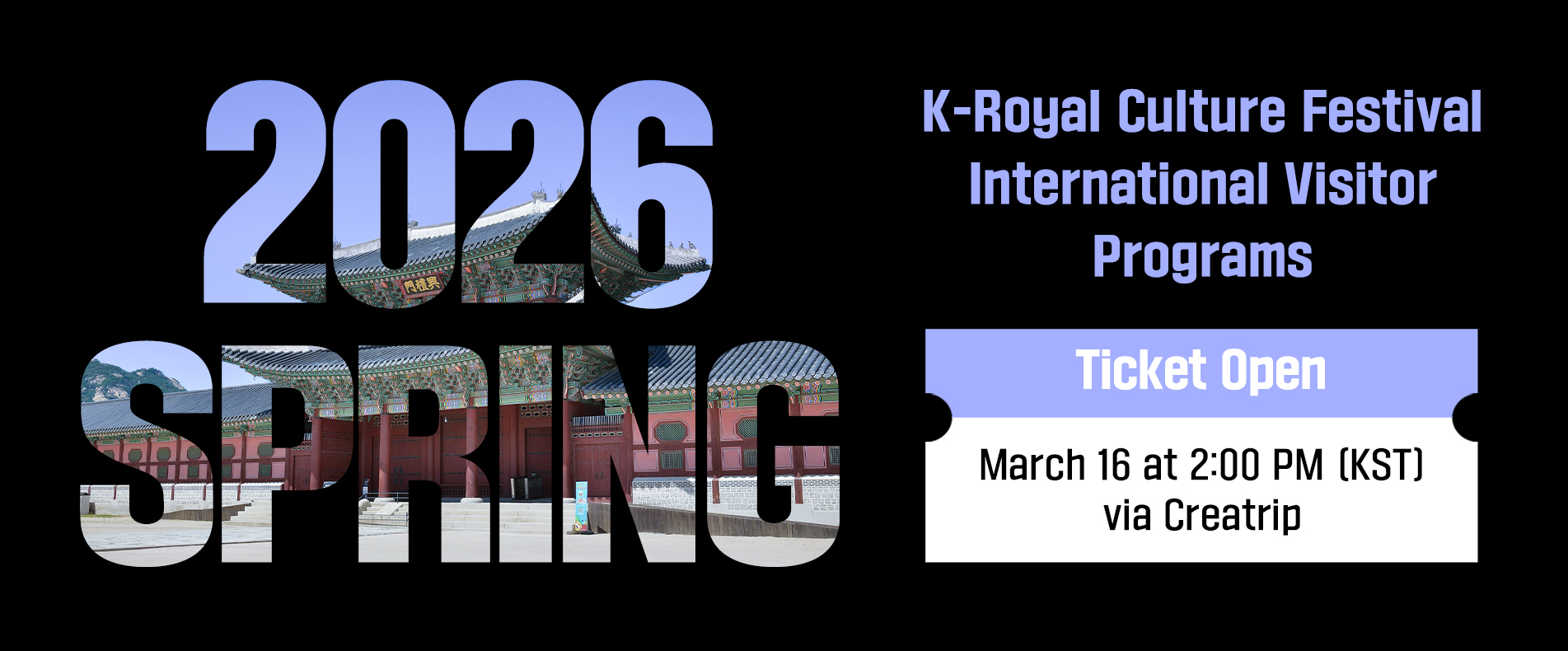 "Experience the Majesty of Spring: The 2026 K-Royal Culture Festival" - From a festival to watch to a festival to participate in... 24 programs capturing the unique character of each palace Expansion of programs for international visitors... An inclusive festival reaching children and the socially vulnerable Hosted by the Royal Palaces and Tombs Center of the Korea Heritage Service (Acting Director Ahn Ho) and organized by the Korea Heritage Agency (President Lee Gui-yeong), the K-Royal Culture Festival Spring 2026 (hereinafter, the “Festival”) will take place for nine days, from April 25 to May 3, at Seoul’s five royal palaces—Gyeongbokgung Palace, Changdeokgung Palace, Deoksugung Palace, Changgyeonggung Palace, and Gyeonghuigung Palace—as well as Jongmyo Shrine.   Now in its 12th year, the Festival is South South Korea’s largest national heritage festival featuring traditional culture content set against the backdrop of the royal palaces. it drew a record-breaking 1.37 million visitors—the highest attendance to date—garnering significant attention from both domestic and international audiences.   The 2026 Spring K-Royal Culture Festival, themed “Palaces, Awakening the Arts,” will present a diverse array of programs centered on four key directions: Immersive experiences where visitors participate as protagonists within the performances; Art-specialized programs that highlight the unique historical identity of each palace; Expanded participation for international visitors and strengthened multilingual services; Enhanced inclusive programs designed for everyone to enjoy together, including children, the elderly, the socially vulnerable, and local small business owners.   At Gyeongbokgung Palace, the Festival will kick off with the Opening Ceremony (Apr. 24) at Heungnyemun Gate Square. Directed by Yang Jeong-woong, who served as the Artistic Director for the 2025 APEC Summit cultural events, the performance titled “Palaces, Awakening the Arts – Hyper Palace” will blend the modern sensibilities of K-content with the timeless aesthetics of the royal court.   Hosted by announcer Oh Jung-yeon, the program will begin with the National Dance Company of Korea’s Mongyudowonmu. It will also feature a wide range of performances, including “Ganggangsullae” by rapper Woo Won-jae and the Performance Arts Group of the Korea Heritage Agency, as well as a hanbok fashion show combined with gugak (Korean traditional music) EDM. Highlights will include a collaborative stage featuring Choi Hojong, winner of Mnet’s male dance survival program Stage Fighter, and Heo Yoon-jeong, an apprentice graduate in Geomungo Sanjo, a National Intangible Heritage tradition. The lineup will also include a joint performance by vocalist Choi Ye-rim and the Noah Children’s Choir, as well as a reinterpreted Bongsan Mask Dance performance by AIKI with HOOK. The finale will feature a media facade mapping show and Hyangamurak by the National Gugak Center, showcasing the essence of royal court dance.   Visitors can experience “A Time Travel, Gyeongbokgung (Apr. 25–29),” a large-scale immersive program that recreates the living history of the Joseon Dynasty. Additionally, “Royal Palace Daily Life (Apr. 25–29)” allows visitors to encounter various Joseon-era artists and artisans across the palace grounds: starting with the King’s morning audience at Geunjeongjeon Hall, and moving to the royal painters at Sujeongjeon Hall, as well as court musicians and seamstresses in the residential quarters. In “Newcomers of Royal Palace (Apr. 25–29),” visitors can experience court culture more deeply from the bearers of intangible heritage. At the “Children’s K-Royal Culture Festival (May 1–3),” children can participate in hands-on career experiences, learning about Joseon-era professions such as royal physicians (uigwan), guards (gapsa), royal chefs (suksu), court historians (sagwan), and military bands (chwitadae), while also enjoying fusion performances that blend tradition with modernity.   The “A Stroll to Gyeonghoeru with Royal Court Musicians (Apr. 25–May 3)” program, designed for the socially vulnerable including single-parent families, offers a special opportunity to create lasting memories at the palace through activities such as playing traditional wind instruments and taking family portraits. Meanwhile, at Heungnyemun Gate Square, the “K-Heritage Market (Apr. 25–May 3)” will operate daily for nine days, featuring 23 booths with craftworks by bearers of National Intangible Heritage traditions and special exhibitions of Joseon royal tribute goods.   At Changdeokgung Palace, the Festival will present “Awakening the Morning Palace (Apr. 28–May 3),” a guided walking tour where visitors can enjoy the serene atmosphere of the palace in the early morning. Additionally, the nighttime program “The Dance of Crown Prince Hyomyeong and the Moon (Apr. 28–30)” will be offered. This multifaceted program recreates the year 1828, when Crown Prince Hyomyeong (posthumously King Munjo) prepared a banquet to celebrate the 40th birthday of his mother, Queen Sunwon. Participants will tour the major halls and the Rear Garden of Changdeokgung, directly experiencing and completing the performance process   In addition, the Injeongjeon Hall of Changdeokgung Palace will host a large-scale traditional arts performance for the first time, titled “Palace Concert – Taepyeongjiak  by 100 Artists (May 1–3)”. Against the backdrop of Injeongjeon at night, a cast of 100 performers, including students and faculty from Ewha Womans University, will present a majestic and magnificent Gugak concert featuring pieces such as Sujecheon, Taepyungga, and Arirang.   At Deoksugung Palace, programs have been prepared to showcase the music and culinary culture of the Korean Imperial Family. “The Royal Recreations Club (Apr. 25–May 3)” will take place at Jeonggwanheon, where visi